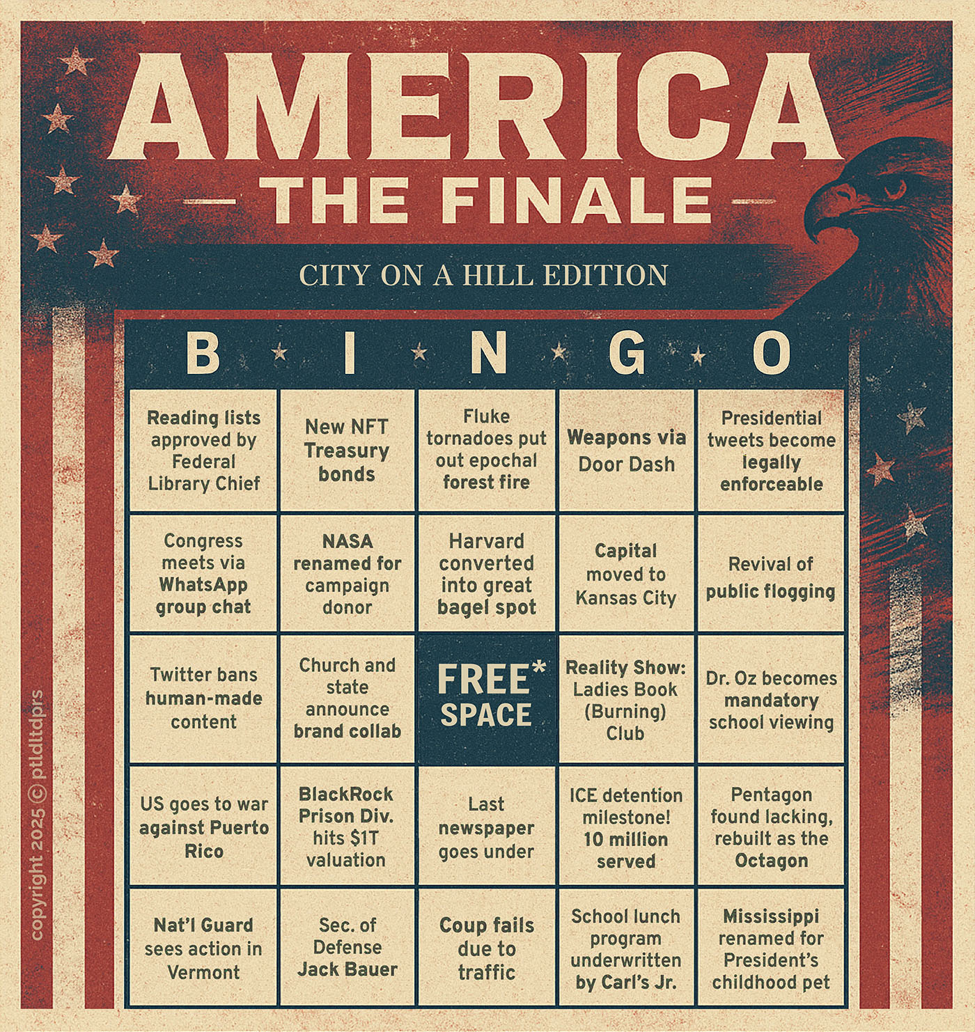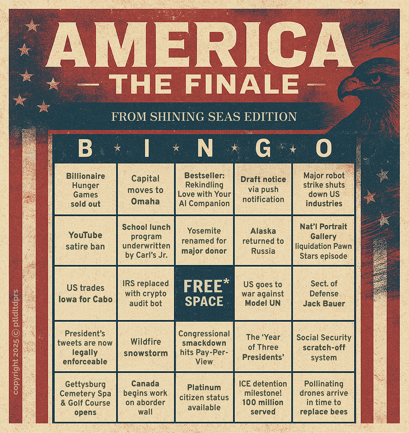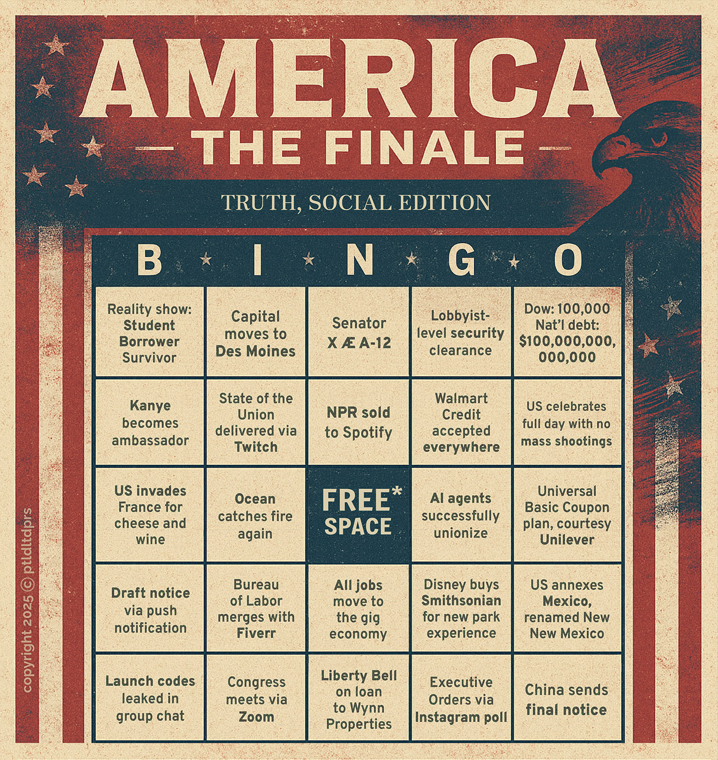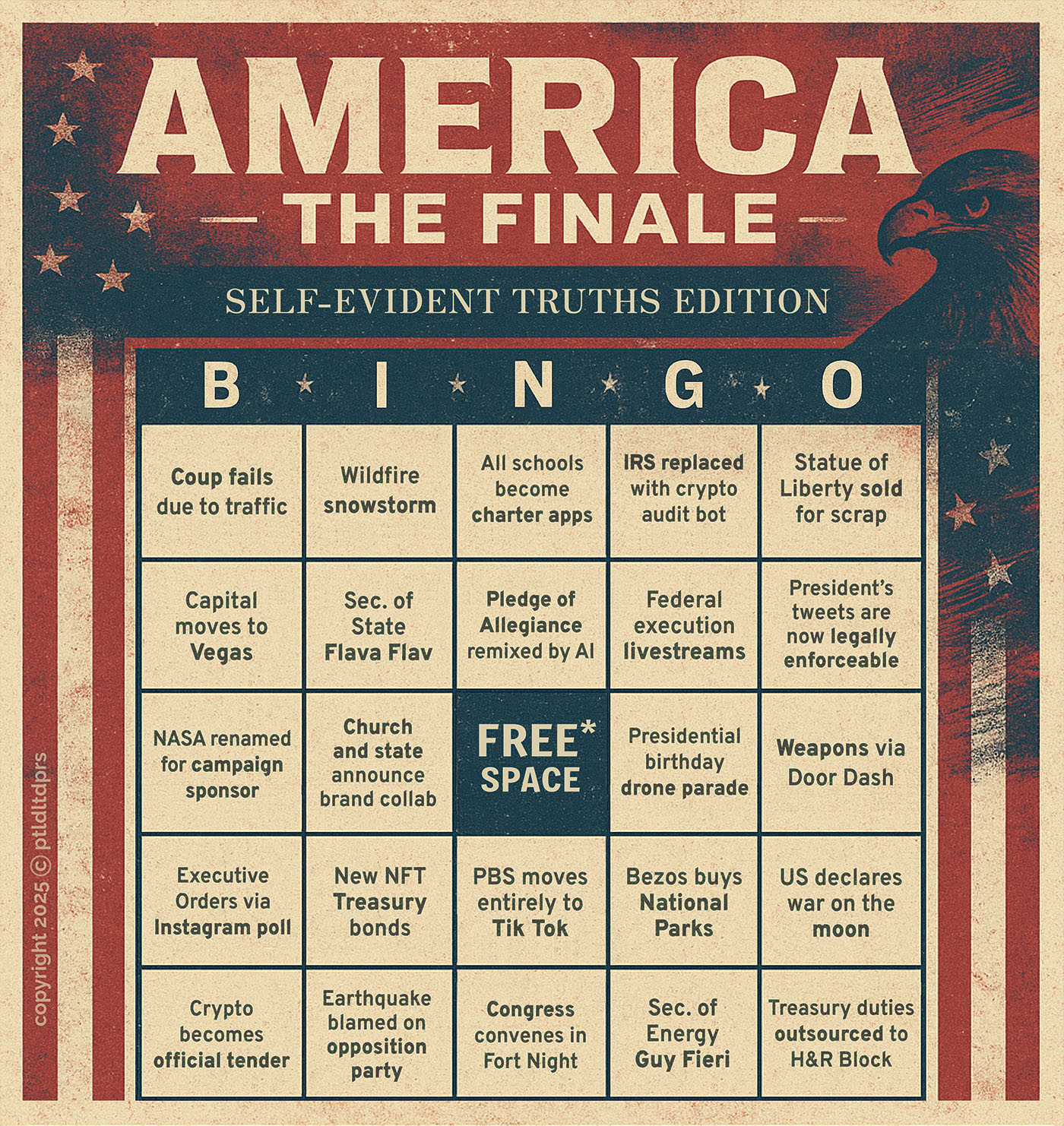 A fast, funny and frighteningly plausible glimpse into the future. Each bingo card is packed with absurd-yet-believable headlines: “Executive Orders via Instagram poll”, “US invades France for cheese and wine.” Laugh, groan and race to call ‘Bingo!’ as reality inches closer to parody… and maybe fight back just a little bit.*